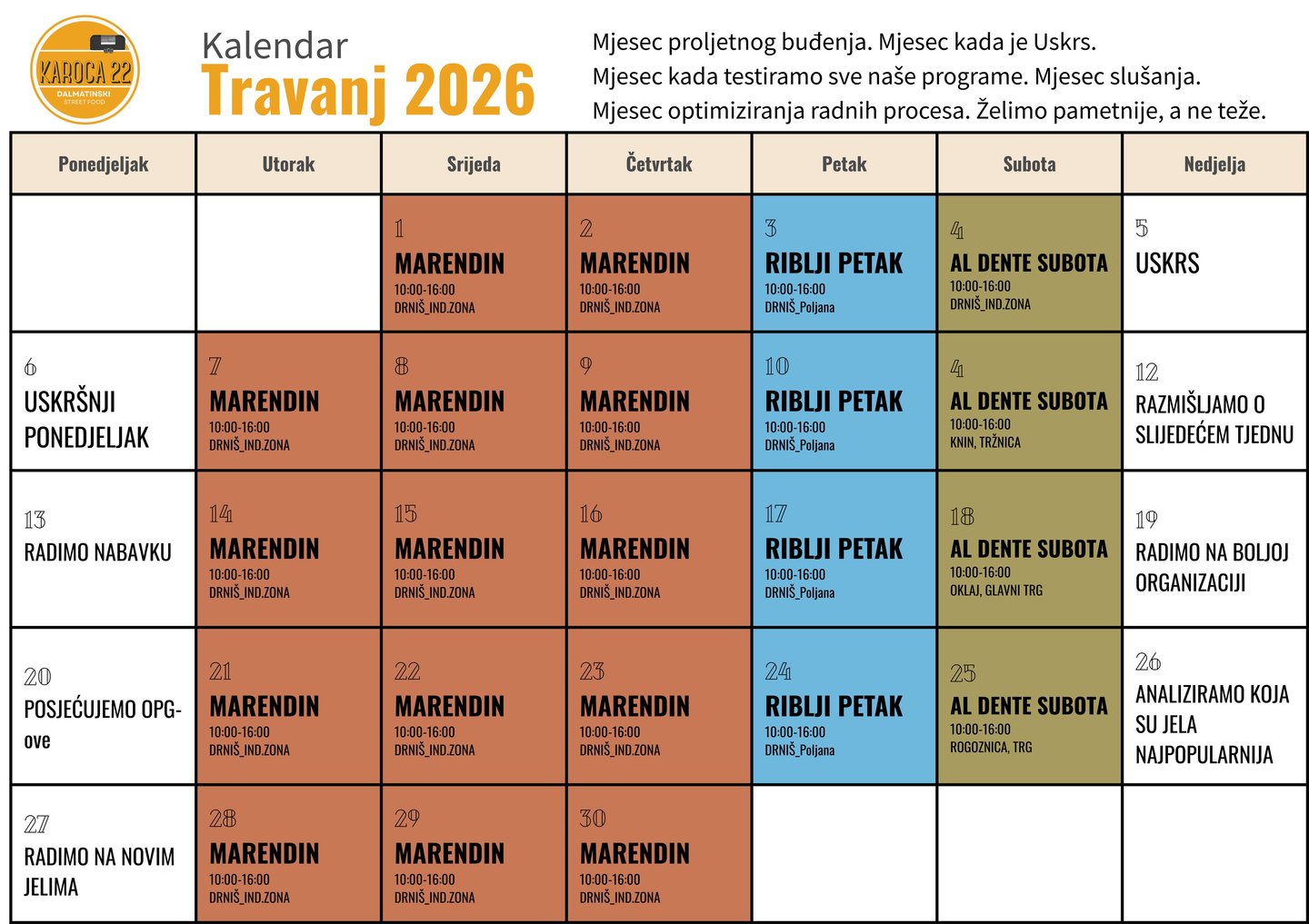 Pronađite nas prema mjesečnom kalendaru. Postoji mogućnost promjene lokacije zbog prilagodbe lokalnim festivalima i feštama.